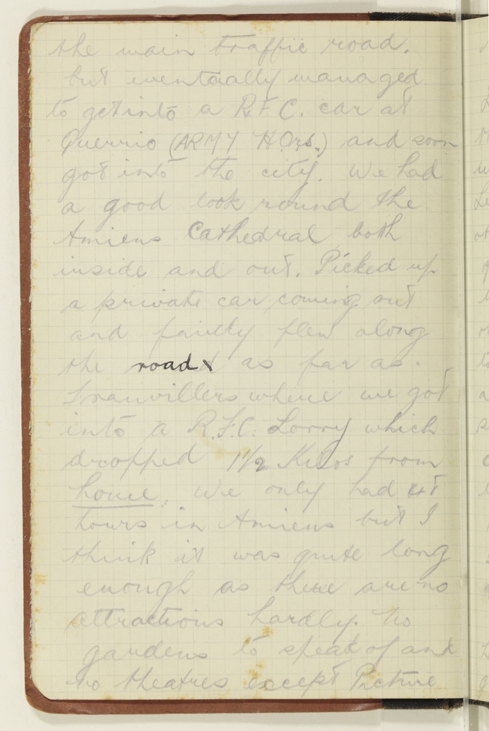 the main traffic road but eventually managed to get into a RFC car at Querrio (ARMY Hqrs) and soon got into the city. We had a good look round the Amiens Cathedral both inside and out. Picked up a private car coming out and fairly flew along the road as far as Franvillers where we got into a R.F.C. Lorry which dropped 1½ Kilos from house. We only had 48 hours in Amiens but I think it was quite long enough as there are no attractions hardly. No gardens to speak of and no theatres except Picture.