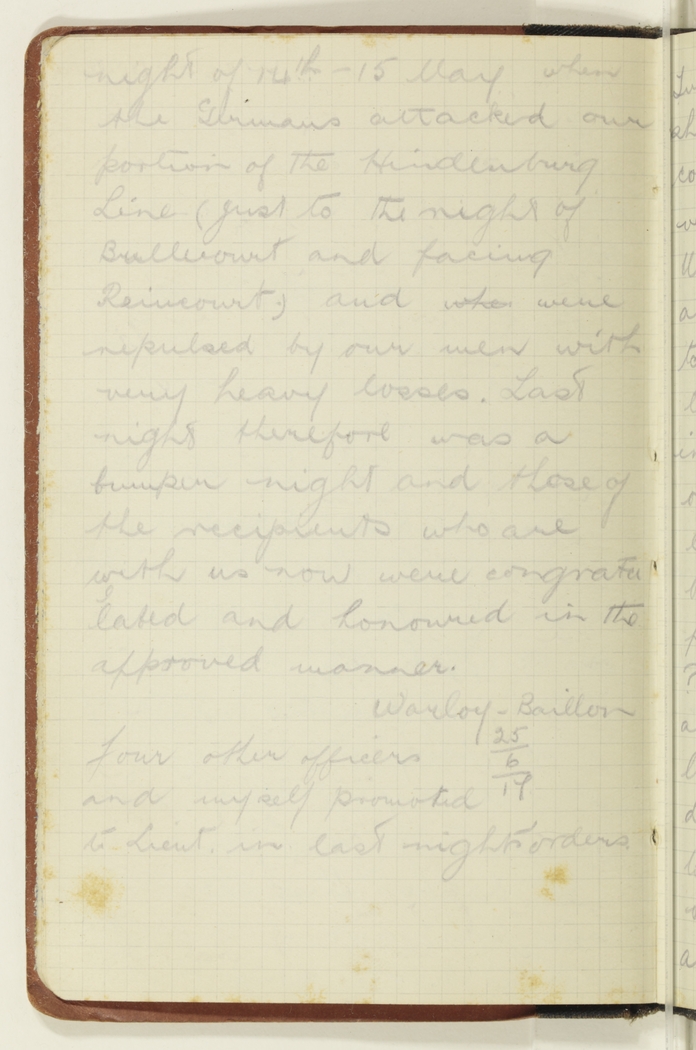 night of 14th – 15th May when the Germans attacked our portion of the Hindenburg Line (just to the right of Bullecourt and facing Reincourtz and when were repulsed by our men with very heavy losses. Last night therefore was a bumper night and those of the recipients who are with us now were congratulated and honoured in the approved manner.