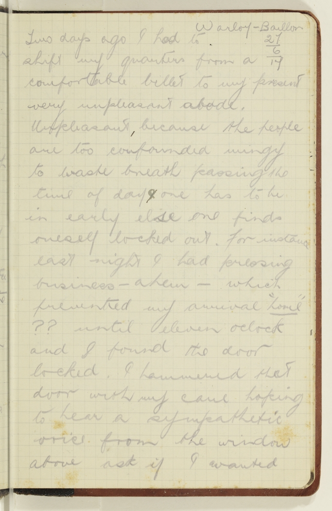 Two days ago I had to shift my quarters from a comfortable billet to my present very unpleasant abode. Unpleasant, because the people are too confounded mingy to waste breath passing the time of day – one has to be in early else one finds oneself locked out. For instance, last night I had pressing business – ahem – which prevented my arrival "home" ?? until eleven oclock and I found the door locked. I hammered that door with my cane hoping to hear a sympathetic voice from the window above ask if I wanted