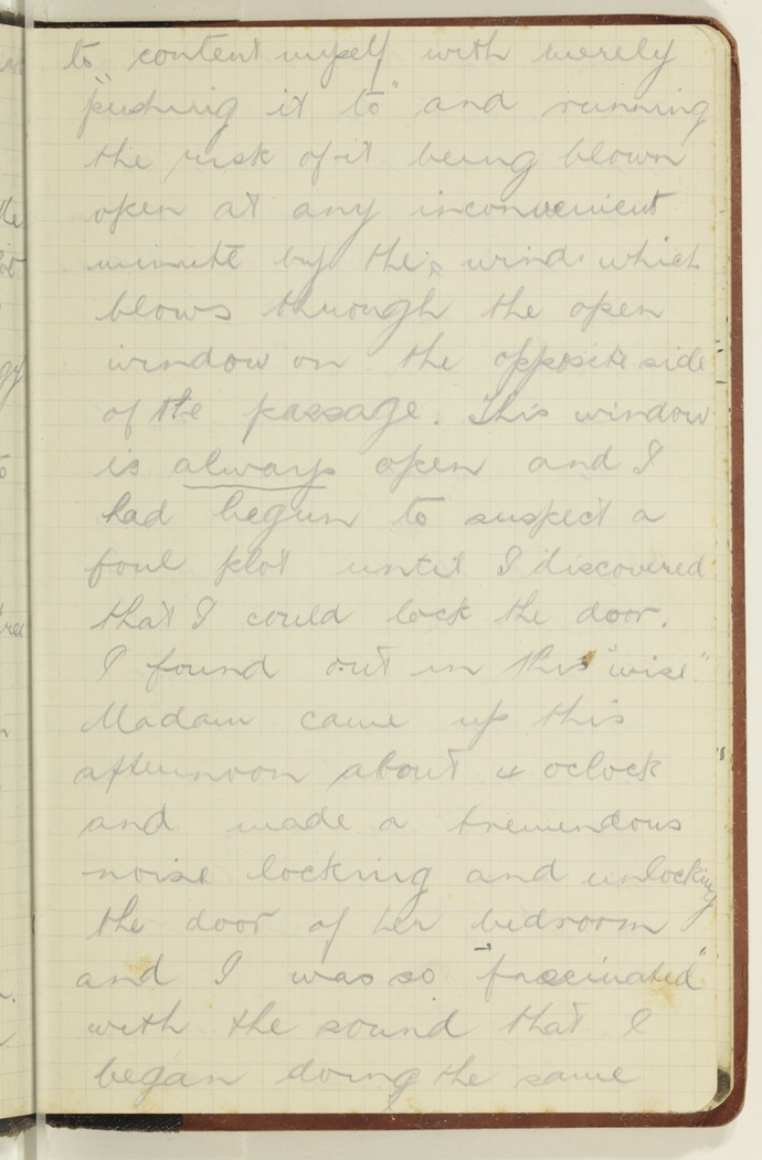 to content myself with merely "pushing it to" and running the risk of it being blown open at any inconvenient minute by the wind which blows through the open window on the opposite side of the passage. This window is always open and I had begun to suspect a foul plot until I discovered that I could lock the door. I found out in this "wise" Madam came up this afternoon about 4 oclock and made a tremendous noise locking and unlocking the door of her bedroom and I was so "fascinated" with the sound that I began the same