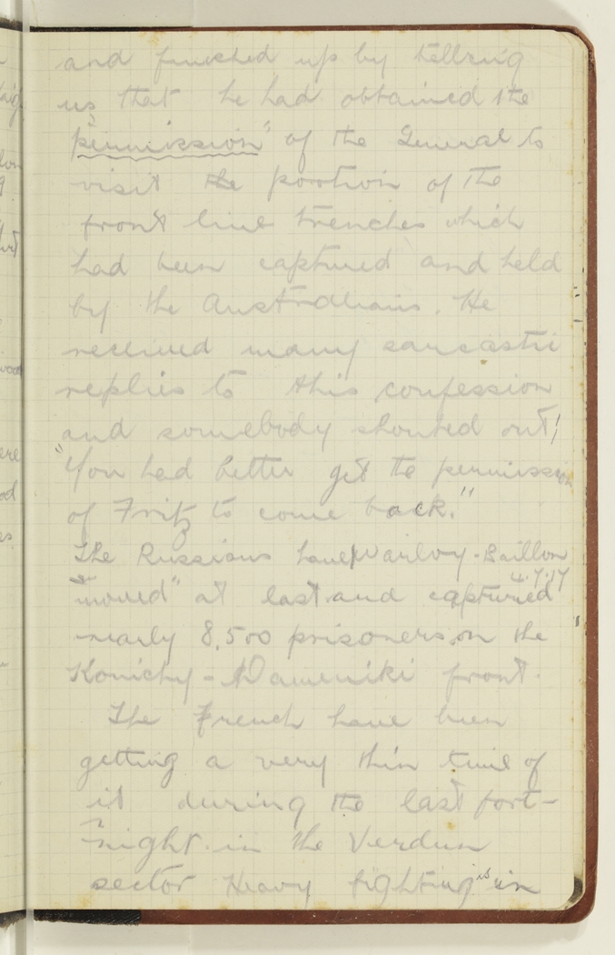 and finished up by telling us that he had obtained the permission of the General to visit the portion of the front line trenches which had been captured and held by the Australians. He received many sarcastic replies to this confession and somebody shouted out "You had better get the permission of Fritz to come back".