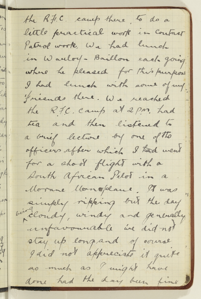 the R.F.C. camp there, to do a little practical work in contact Patrol work. We had lunch in Warloy-Baillon each going where he pleased for this purpose. I had lunch with some of my Friends there. We reached the R.F.C. camp at 2 p.m. had tea and then listened to a brief lecture by one of the officers after which I had went for a short flight with a South African Pilot in a Morane Monoplane. It was simply ripping but the day being cloudy, windy and generally unfavourable we did not stay up long and of course I did not appreciate it quite as much as I might have done had the day been fine
