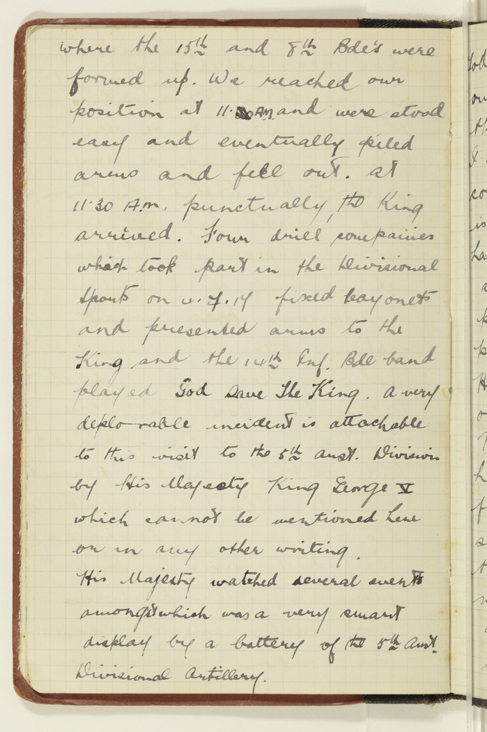 where the 15th and 8th Bde's were formed up. We reached our position at 11 30 A.M. and were stood easy and eventually piled arms and fell out. At 11.30 A.M, punctually, the King arrived. Four drill companies which took part in the Divisional Sports on 4.7.17 fixed bayonets and presented arms to the King and the 14th Inf. Bde band played God Save the King. A very deplorable incident is attachable to this visit to the 5th Aust. Division by His Majesty King George V which cannot be mentioned here or in any other writing.
