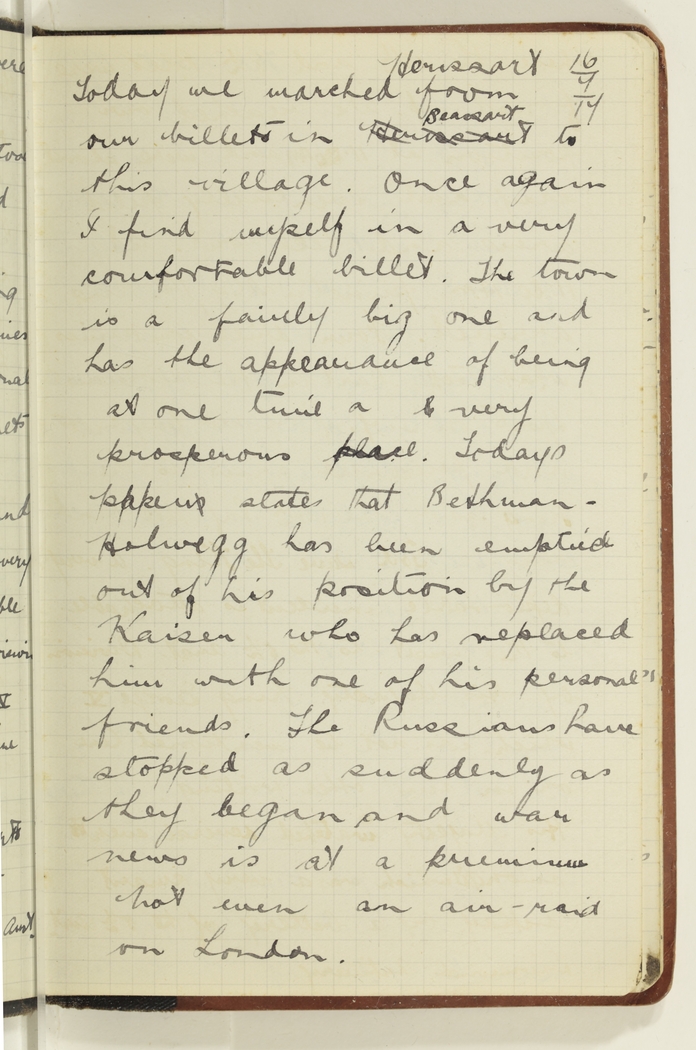 Today we marched from our billets in Herissart Beassart to this village. Once again I find myself in a very comfortable billet. The town is a fairly big one and has the appearance of being at one time a b very prosperous place. Todays paper states that Bethman-Holwegg has been emptied out of his position by the Kaiser who has replaced him with one of his personal friends. The Russians have stopped as suddenly as they began and war news is at a premium not even an air-raid on London.