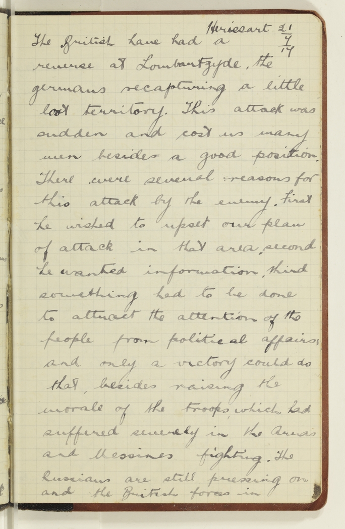 us many men besides a good position. There were several reasons for this attack by the enemy. First he wished to upset our plan of attack in that area, second he wanted information, third something had to be done to attract the attention of the people from political affairs, and only a victory could do that, besides raising the morale of the troops, which had suffered severely in the Arras and Messines fighting. The Russians are still pressing on and the British forces in