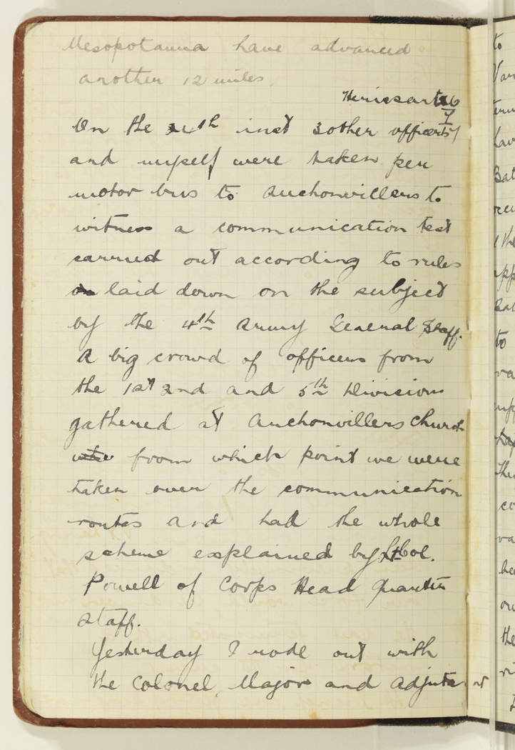 On the 24th inst 3 other officers and myself were taken per motor bus to Auchonvillers to witness a communication test carried out according to rules on laid down on the subject by the 4th Army General Staff. A big crowd of officers from the 1st 2nd and 5th Divisions gathered at Auchonvillers Church whe from which point we were taken over the communication routes and had the whole scheme explained by Lt.Col. Powell of Corps Head Quarters staff.