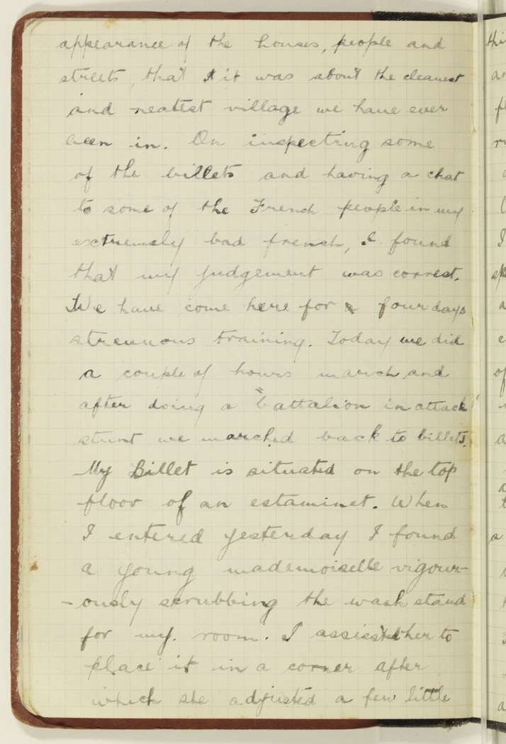 appearance of the houses, people and streets that I it was about the cleanest and neatest village we have ever been in. On inspecting some of the billets and having a chat to some of the French people in my extremely bad French, I found that my judgement was correct. We have come here for a four days strenuous training. Today we did a couple of hours march and after doing a "battalion in attack" stunt we marched back to billets. My Billet is situated on the top floor of an estaminet. When I entered yesterday I found a young mademoiselle vigourously scrubbing the washstand for my room. I assisted her to place it in a corner after which she adjusted a few little