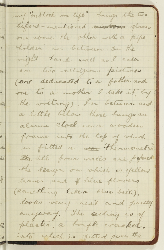 my "outlook on life" hangs the two before-mentioned windows glasses one above the other with a pipe holder in between. On the right hand wall as I enter are two religious pictures (one dedicated to a father and one to a mother I take it, by the writing). In between and a little below these hangs an alarm clock in a wooden frame into the top of which is fitted a woo "thermometre" The. All four walls are papered, the design on which is yellow leaves and blue flowers (something like a blue bell), looks very neat and pretty anyway. The ceiling is of plaster, a trifle cracked, into which is fitted over the