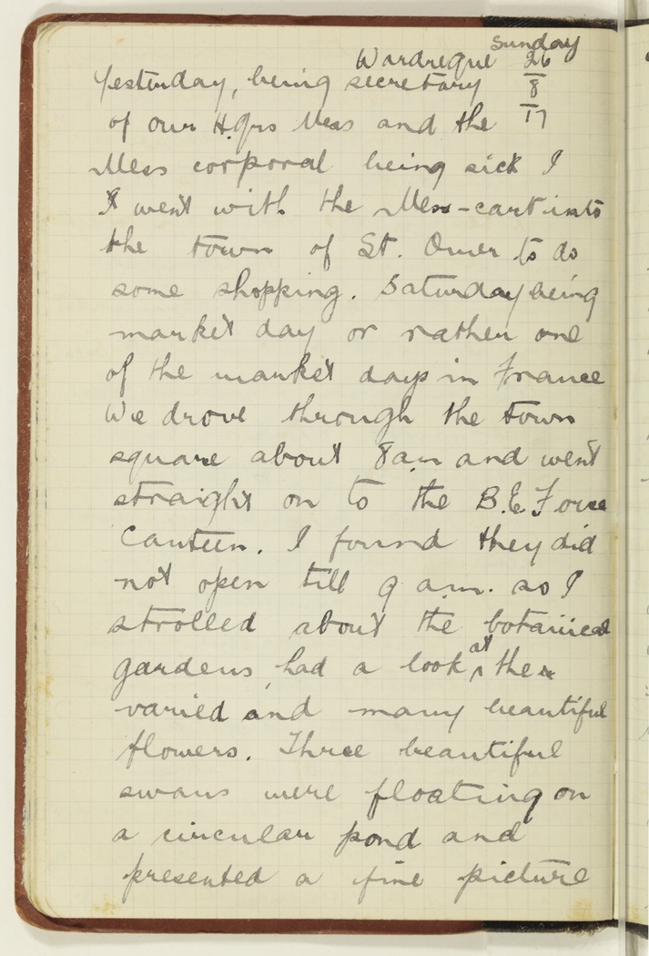 Yesterday, being secretary of our H.qrs Mess and the Mess corporal being sick I I went with the Mess-cart into the town of St. Omer to do some shopping, Saturday being market day or rather one of the market days in France. We drove through the town square about 8 a.m. and went straight on to the B.E. Force canteen. I found they did not open till 9 a.m, so I strolled about the botanical gardens, had a look at the varied and many beautiful flowers. Three beautiful swans were floating on a circular pond and presented a fine picture