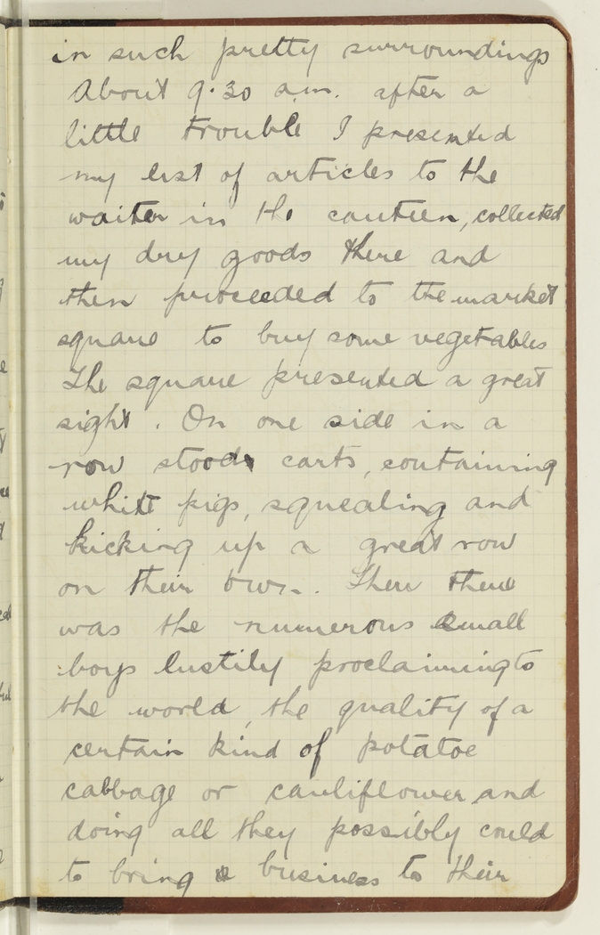 in such pretty surroundings. About 9.30 a.m. after a little trouble I presented my list of articles to the waiter in the canteen, collected my dry goods there and then proceeded to the market square to buy some vegetables. The square presented a great sight. On one side in a row stood carts, containing white pigs, squealing and kicking up a great row on their own. Then there was the numerous small boys lustily proclaiming to the world, the quality of a certain kind of potatoe cabbage or cauliflower and doing all they possibly could to bring business to their
