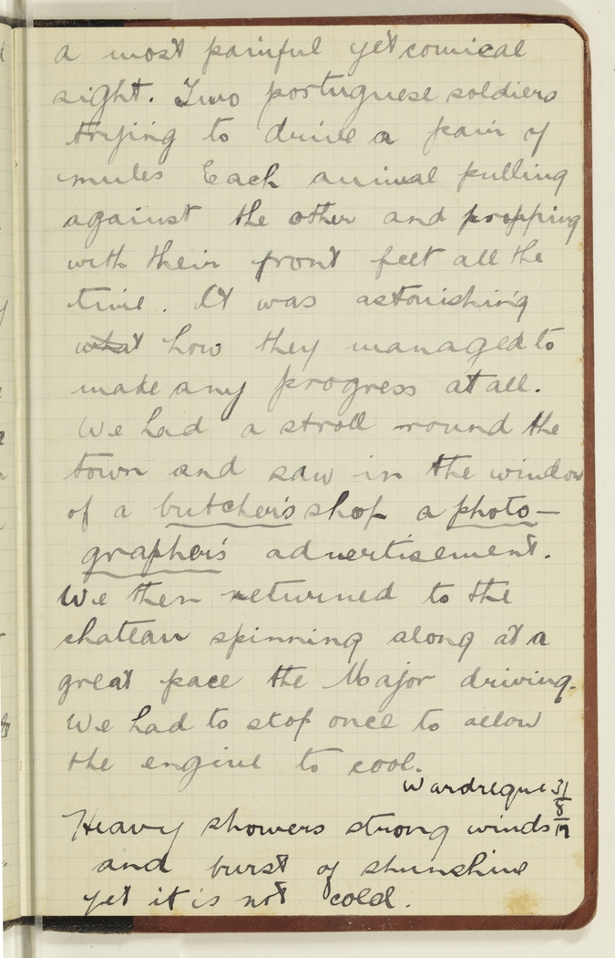 a most painful yet comical sight. Two Portuguese soldiers trying to drive a pair of mules. Each animal pulling against the other and propping with their front feet all the time. It was astonishing what how they managed to make any progress at all. We had a stroll round the town and saw in the window of a butcher's shop a photographer's advertisement. We then returned to the chateau spinning along at a great pace the Major driving. We had to stop once to allow the engine to cool.