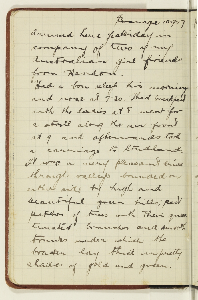 Arrived here yesterday in company of two of my Australian girl friends from Hendon. Had a bon sleep this morning and rose at 7.30. Had breakfast with the ladies at 8, went for a stroll along the sea front at 9 and afterwards took a carriage to Studland. It was a very pleasant drive through valleys bounded on either side by high and beautiful green hills; past patches of trees with their queer twisted branches and smooth trunks under which the bracken lay thick in pretty shades of gold and green,