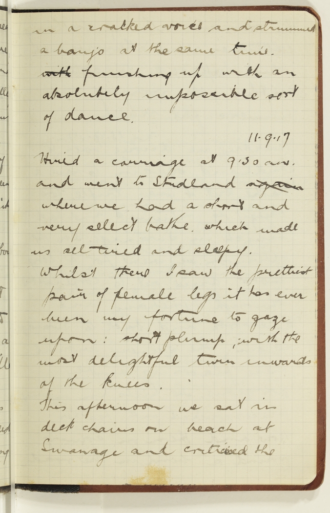 Hired a carriage at 9.30 a.m. and went to Studland again where we had a short and very select bathe, which made us all tired and sleepy. Whilst there I saw the prettiest pair of female legs it has ever been my fortune to gaze upon: short plump; with the most delightful turn inwards of the knees.