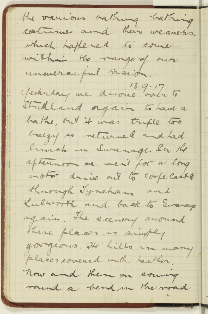 Yesterday we drove over to Studland again to have a bathe, but it was trifle too breezy so returned and had lunch in Swanage. In the afternoon we went for a long motor drive out to Corfe Castle through Lyneham and Lulworth and back to Swanage again. The scenery around these places is simply gorgeous. The hills in many places covered with heather. Now and then on coming round a bend in the road