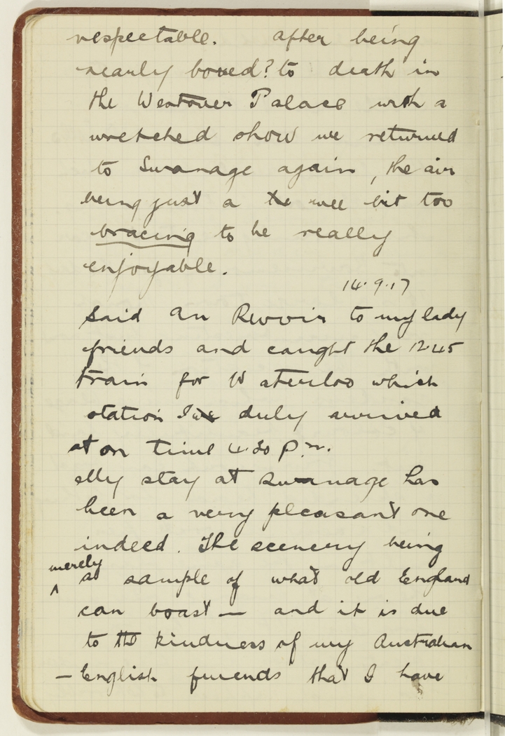 Said au Revoir to my lady friends and caught the 12.45 train for Waterloo which station I we duly arrived at on time 4.30 p.m. My stay at Swanage has been a very pleasant one indeed. The scenery being merely a sample of what old England can boast – and it is due to the kindness of my Australian – English friends that I have