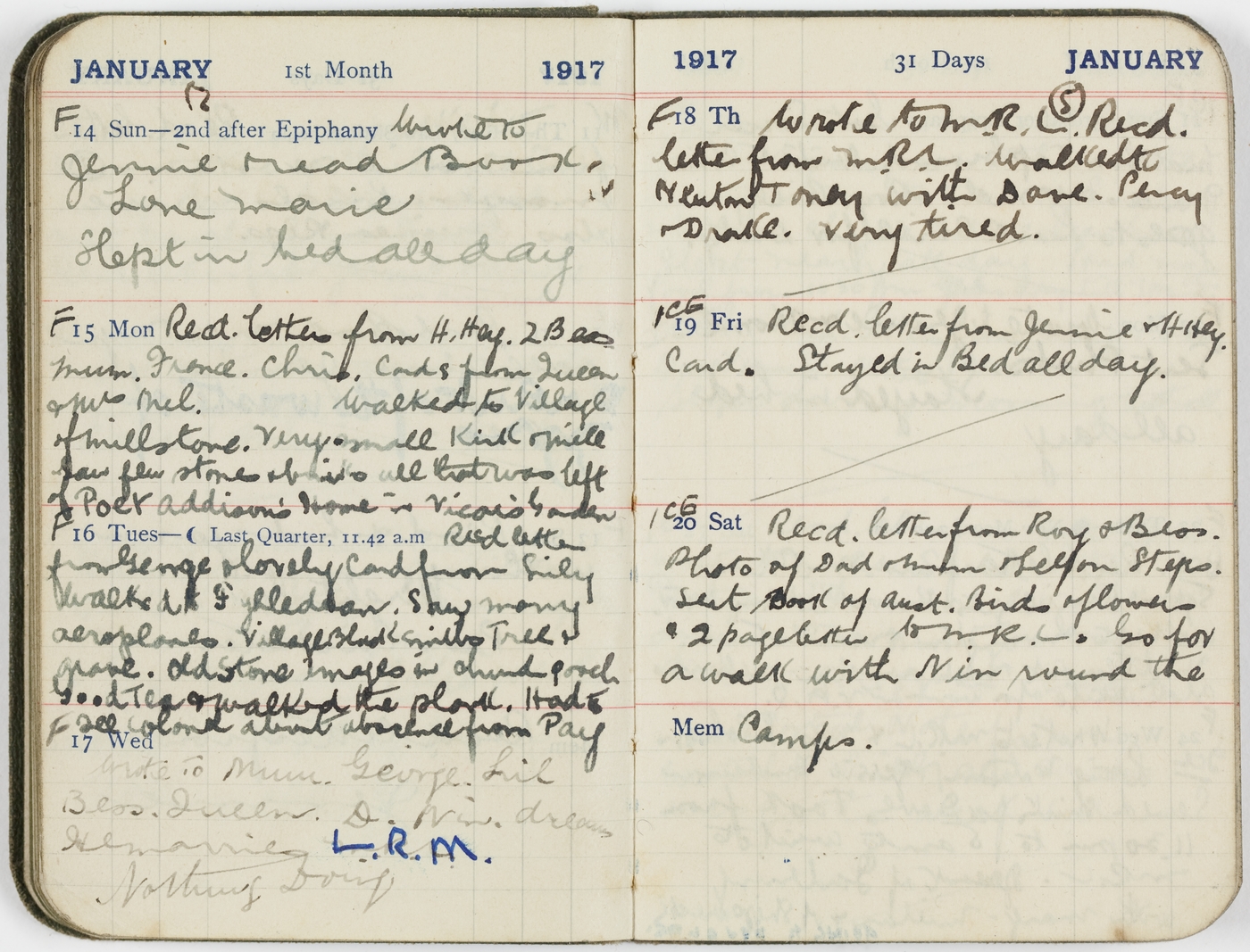 F [17/1/17 Wed] Wrote to Mum, George, Lil Bess. Queen. D. Nin dreams He marries L.R.M. [The original writing is M.R.L who is Nicholls girlfriend and it seems he changed the letters around]