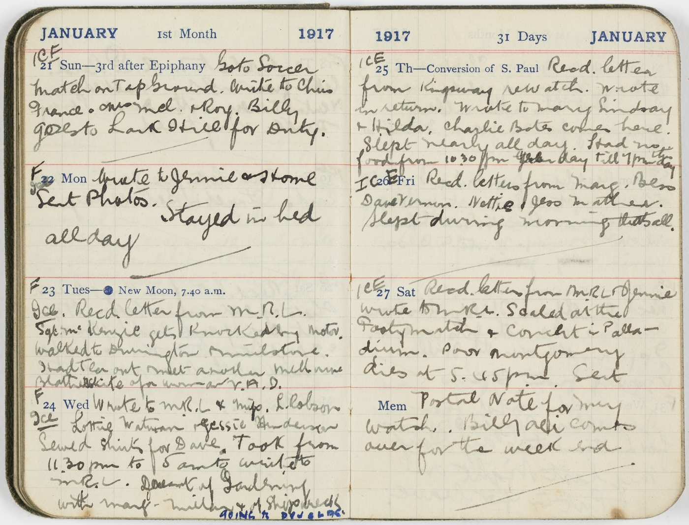 ICE [27/1/17] Sat Recd. letters from M.R.L & Jennie wrote to M.R.L. Goaled at the Footy match & concert in Palladium. Poor Montgomery dies at 5.45p.m. Sent Postal Note for my watch. Billy Ali comes over for the week end