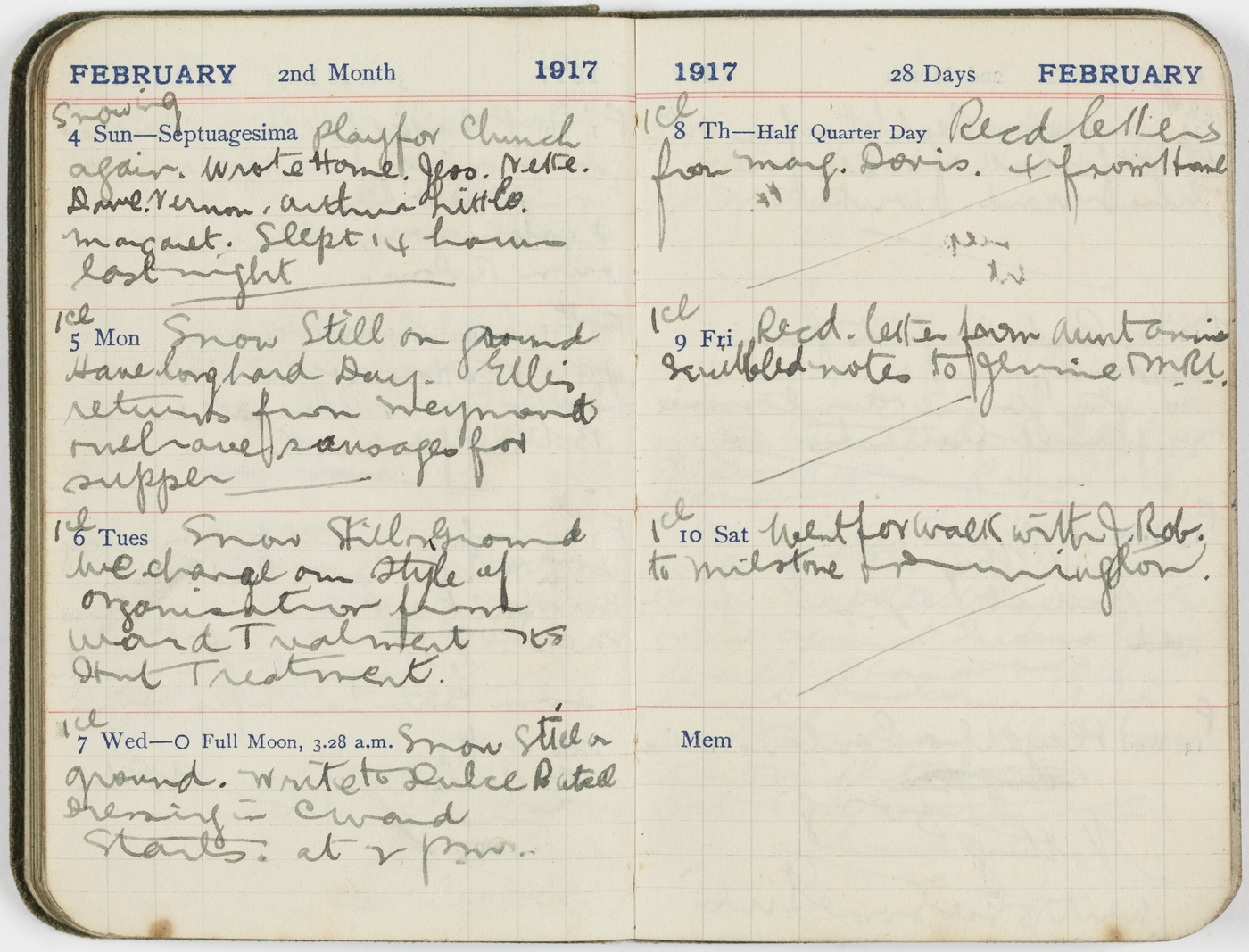 Snowing [4/2/17 Sun] Play for Church again. Wrote Home. Jess. Nette. Dave. Vernon. Arthur Little. Margaret. Slept 14 hours last night