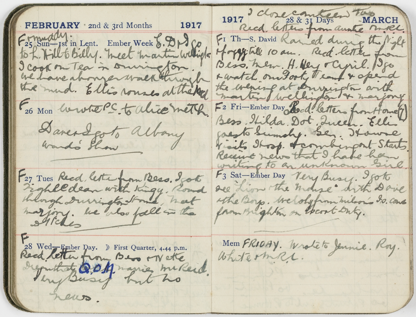 F [2/3/17 Fri] Recd. letters from Home (7) Bess. Hilda. Dot. Queen. Ellis goes to Grimsby. Gen. Howse visits Hosp & combing out Starts. Receive news that I have been writing to an unknown Girl.