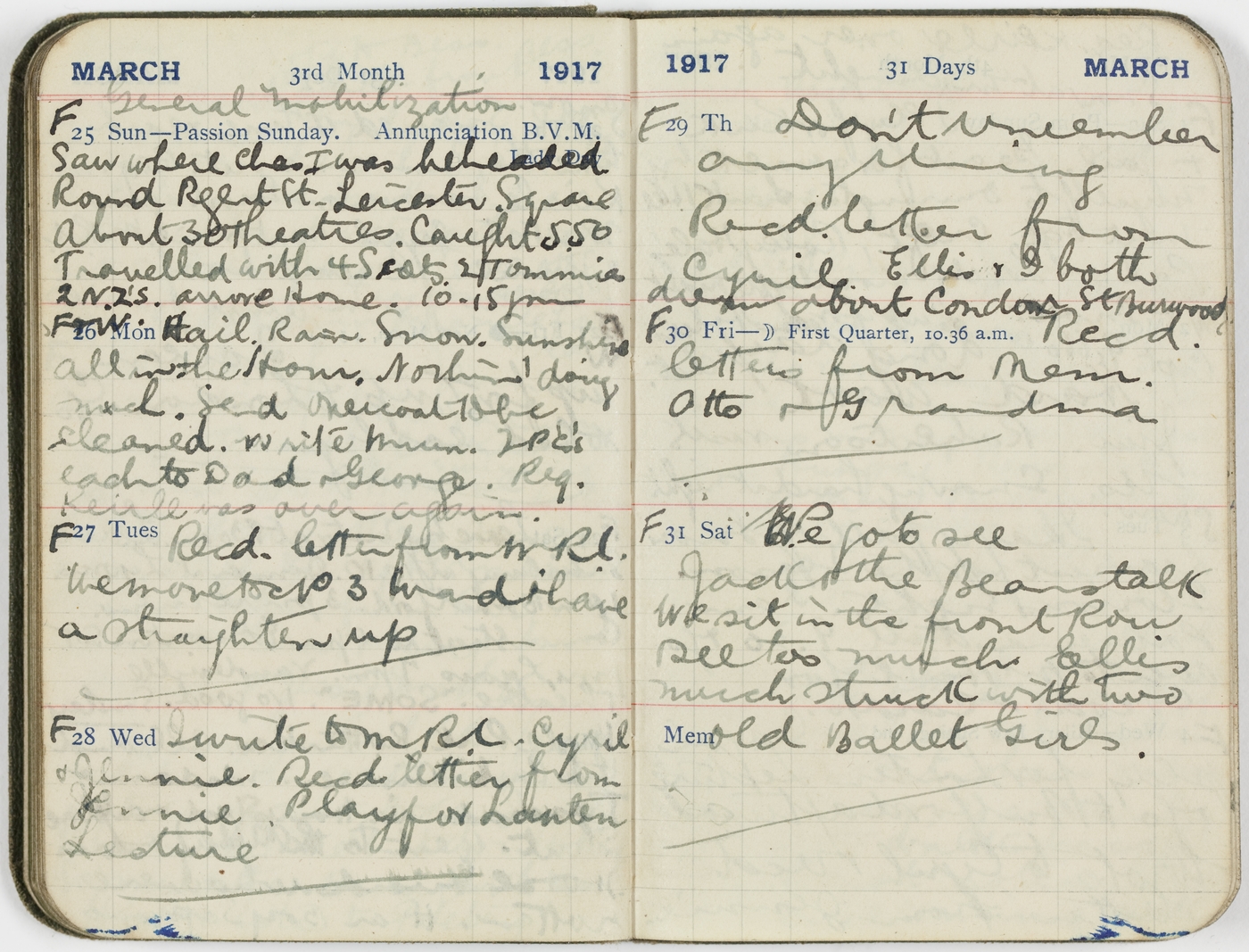 F [28/3/17 Wed] I write to M.R.L. Cyril & Jennie. Recd letter from Jennie. Play for Lantern Lecture