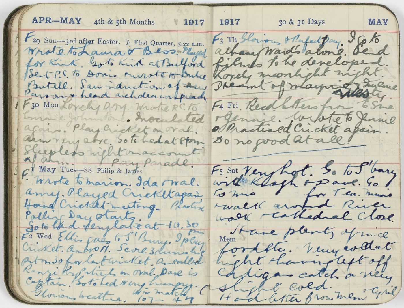 F [30/4/17 Mon] Lovely day. Wrote P.C. to Emmie Johnstone. Inoculated again. Play cricket on oval. Arm very sore. Go to bed at 8pm. Sleepless night on account of arm. Pay Parade.