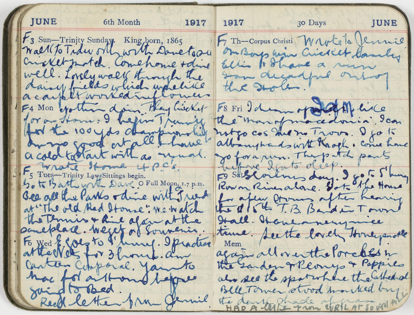 F [6/6/17 Wed] E. goes to S'bury. I practise at the nets for 3 hours. Am Canteen Corp. Yarn to Mac for an Hour before going to Bed. Recd letter from Jennie.