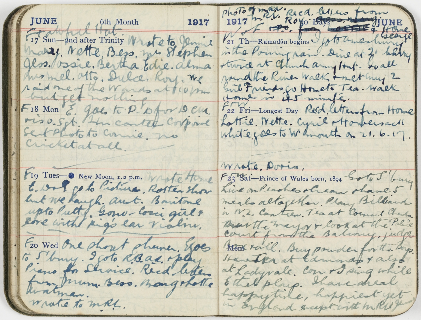 F [20/6/17 Wed] One short shower. E goes to S'bury. I go to R.B.A.A. & play Piano for Service. Recd letters from Mum. Bess. Bong & Lotte Watman.