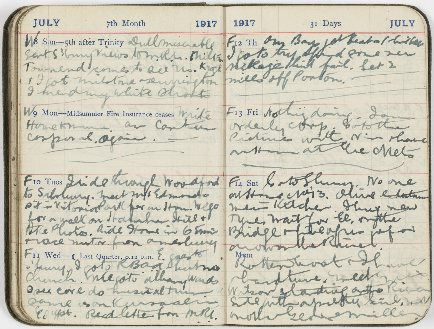F [14/7/17 Sat] Go to Salisbury. No one at Home No 13. Olive [Indecipherable] new Kitchen. I buy new tyres wait for El. on the Bridge & five of us go for down the River. Rotten boat & I have a hard time. Meet Mrs Wilson standing on the River Side with a pretty girl, not another George Miller.