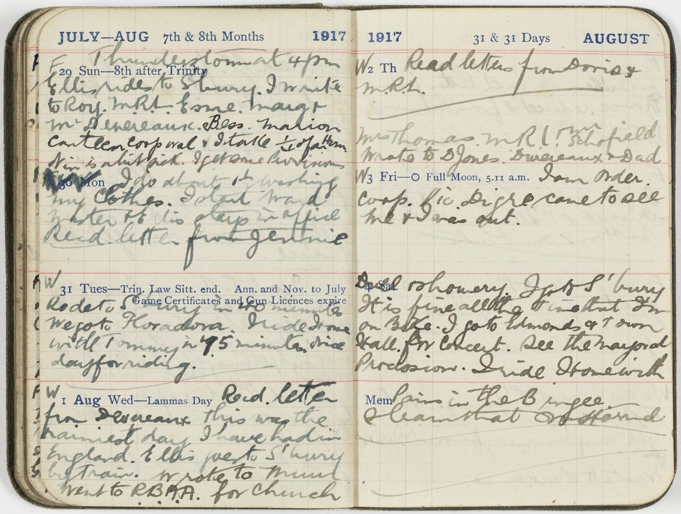 F [29/7/17 Sun] Thunderstorm at 4pm Ellis rides to S'bury. I write to Roy. M.R.L. Esme. Marg & Mr Devereaux. Bess. Marion. Canteen Corporal & I take ¼ of a Ham. Nin is a bit sick. I get some Provisions
