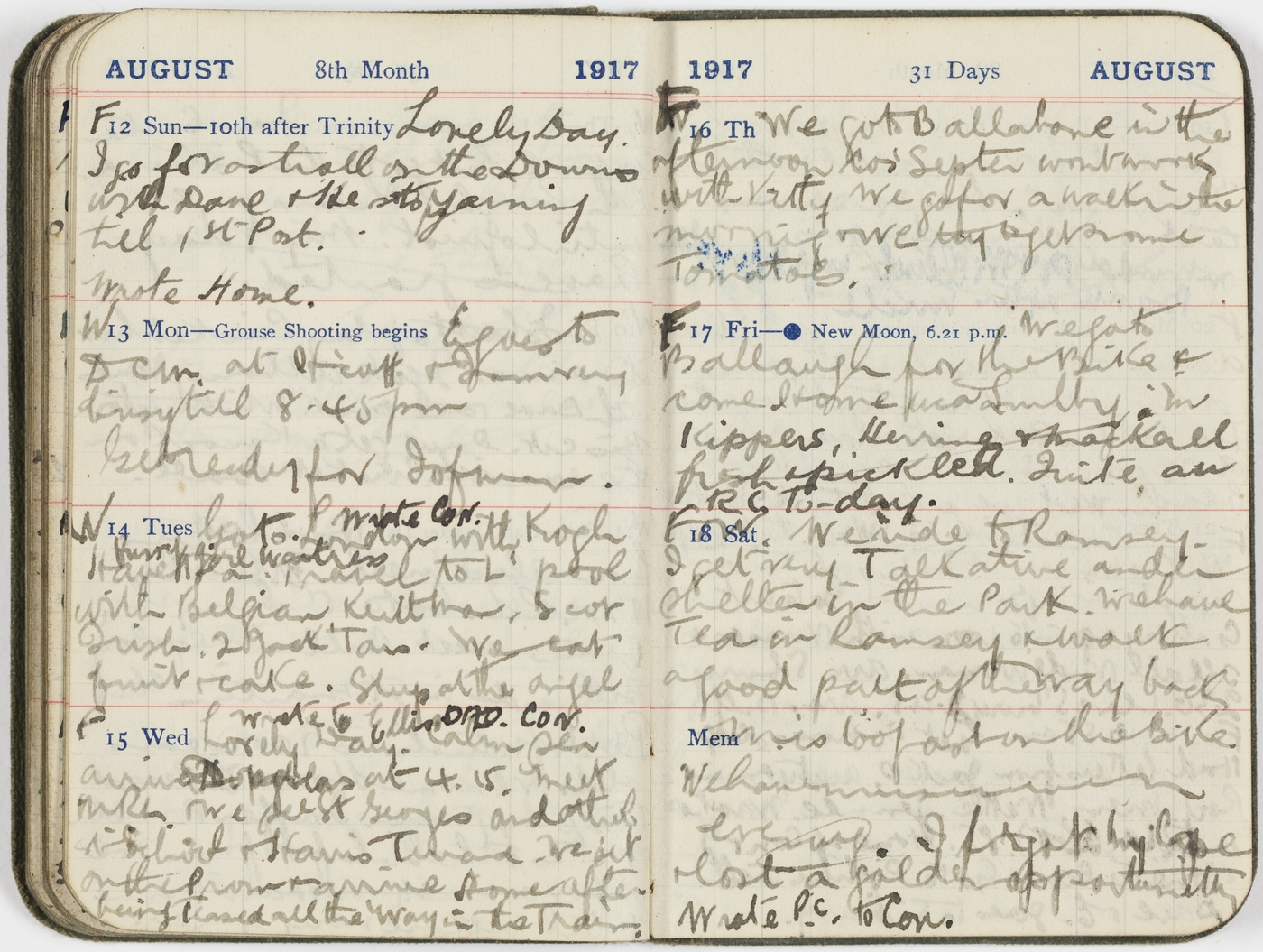 F&W [18/8/17 Sat] We ride to Ramsey. I get very Talkative under shelter in the Park. We have tea in Ramsey & walk a good part of the way back. M. is too fast on the Bike. We have musician evening. I forgot my Cape & lost a golden opportunity. Wrote P.C. top Con