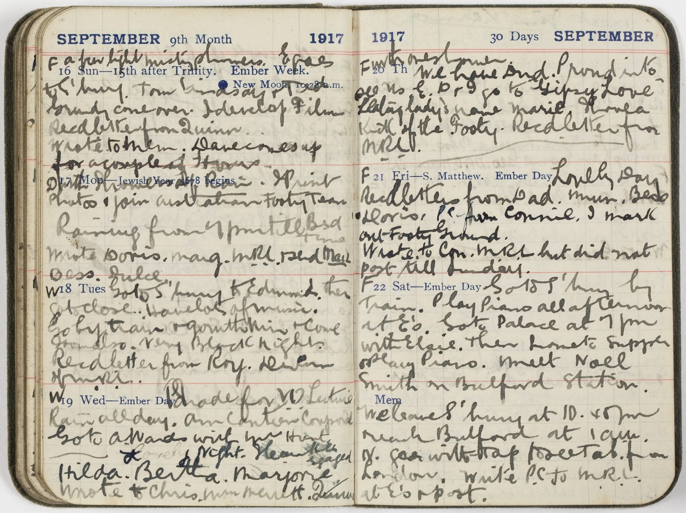 W [18/9/17 Tues] Go to S'bury to Edmond. then go to close. Have lots of music. Go by train & go with Min & Come Home also. Very Black nights. Recd. letter from Roy. Devereau & M.R.L.