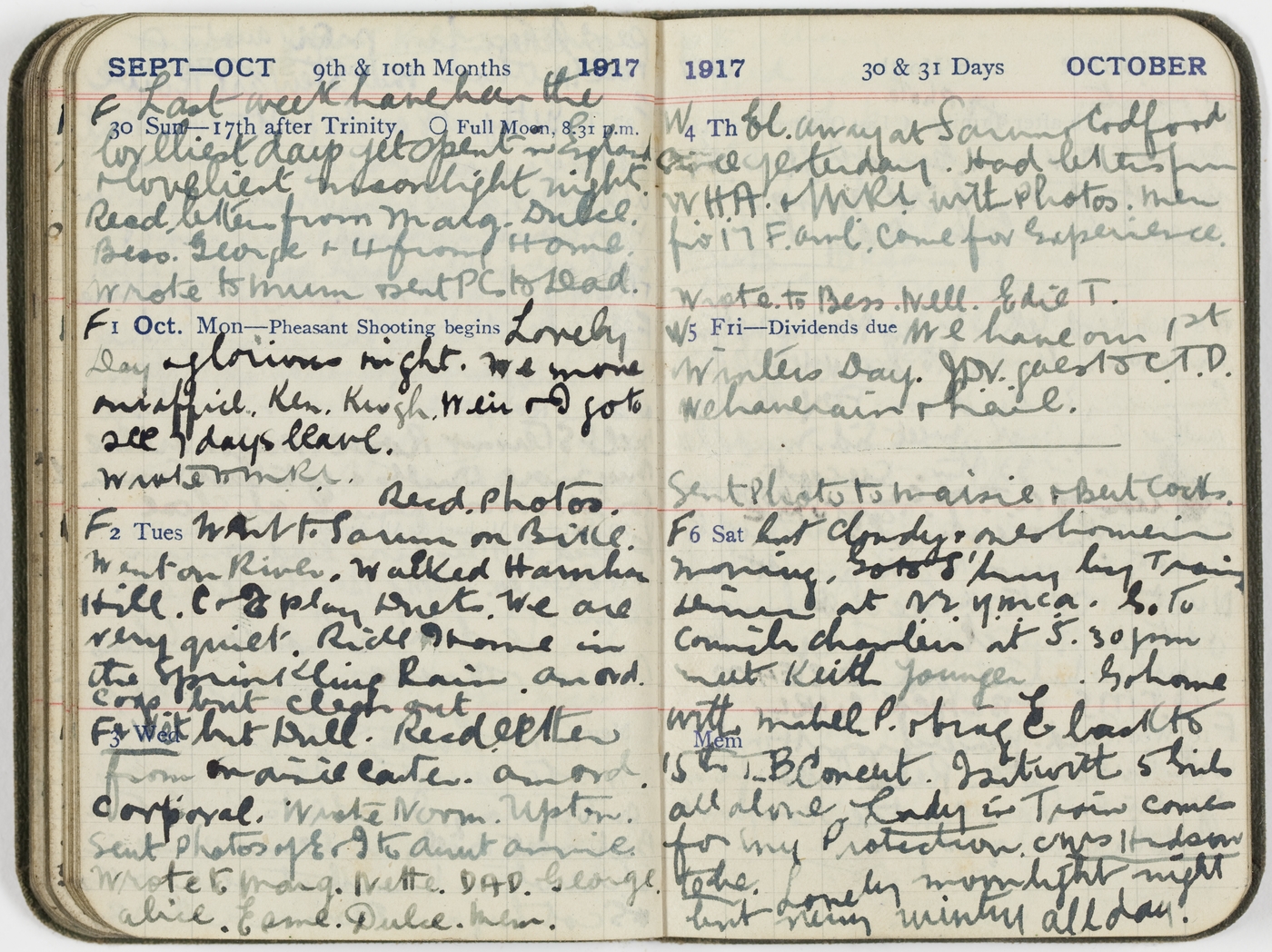 F [30/9/17 Sun] Last week have been the loveliest days yet spent in England & loveliest moonlight nights. Recd. letters from Marg. Dulce. Bess. George & 4 from Home. Wrote to Mum & sent PC to Dad.
