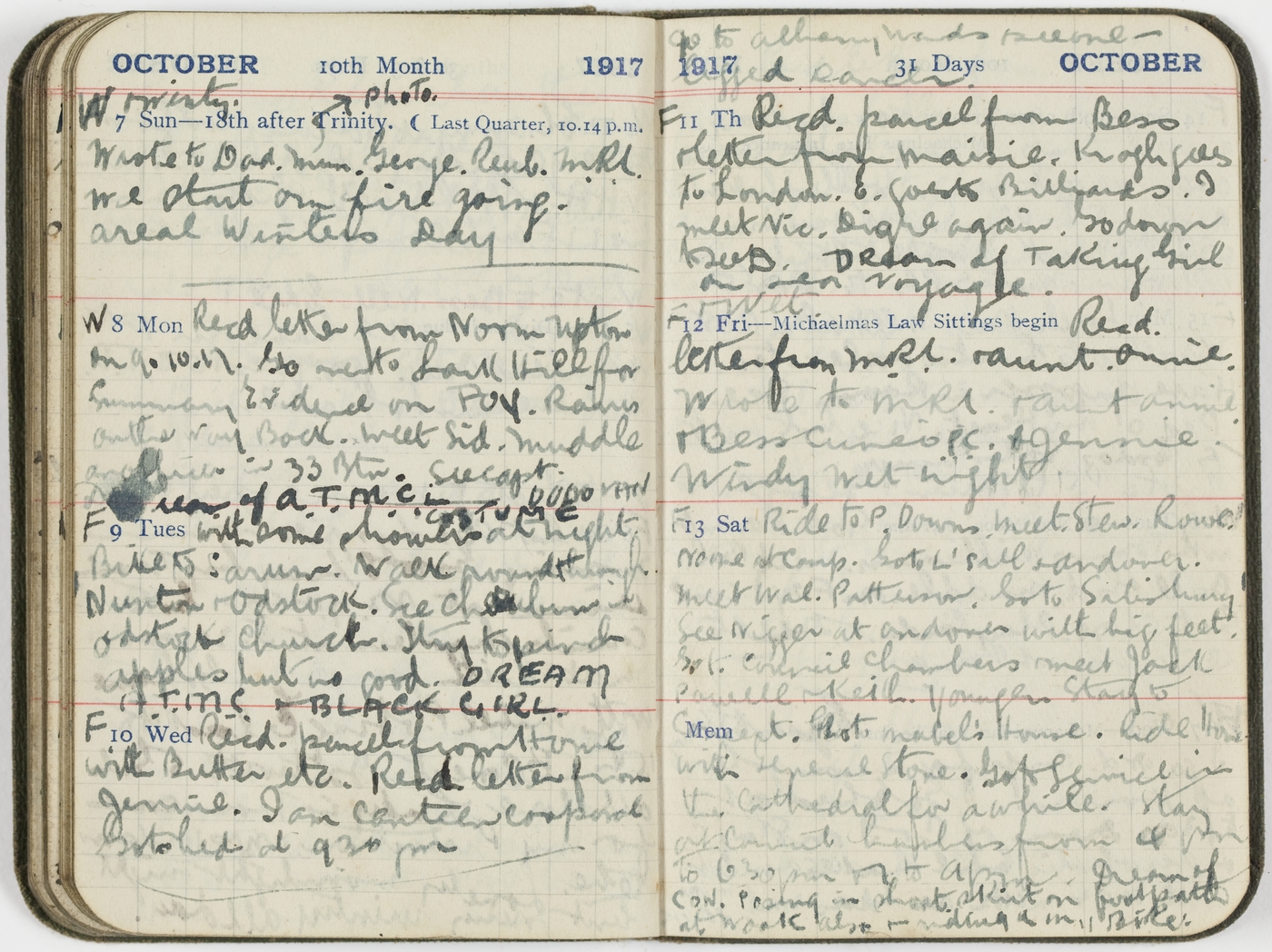 F [11/10/17 Thurs] Go to Albany wards & see one-legged dancer. Recd. parcel from Bess & letter from Maisie. Krogh goes to London. E. goes to Billiards. I meet Nic. Digre again. Go down to see D. Dream of Taking Girl on sea voyage.