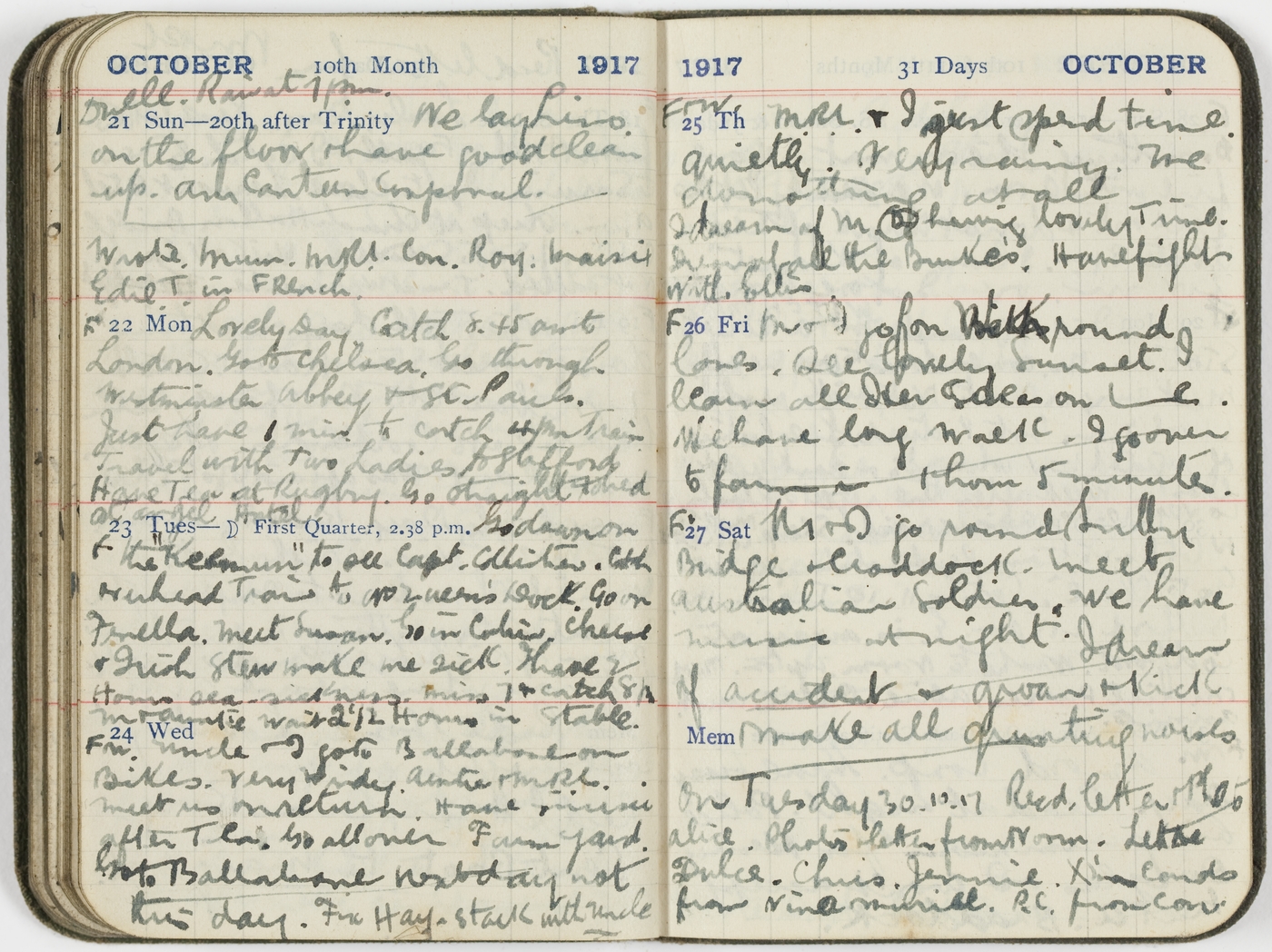 F [27/10/17 Sat] M & I go round Selby Bridge & Craddock. Meet Australian Soldier. We have music at night. I dream of accident & groan & Kick & make all grunting noises