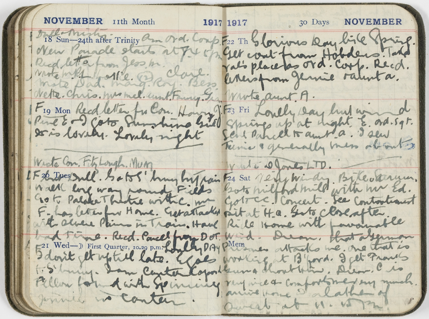 F [21/11/17 Wed] Lovely Day I don't get up til late. E goes to S'bury. I am canteen Corporal. Fellow found with Spinning Jennie in Canteen.