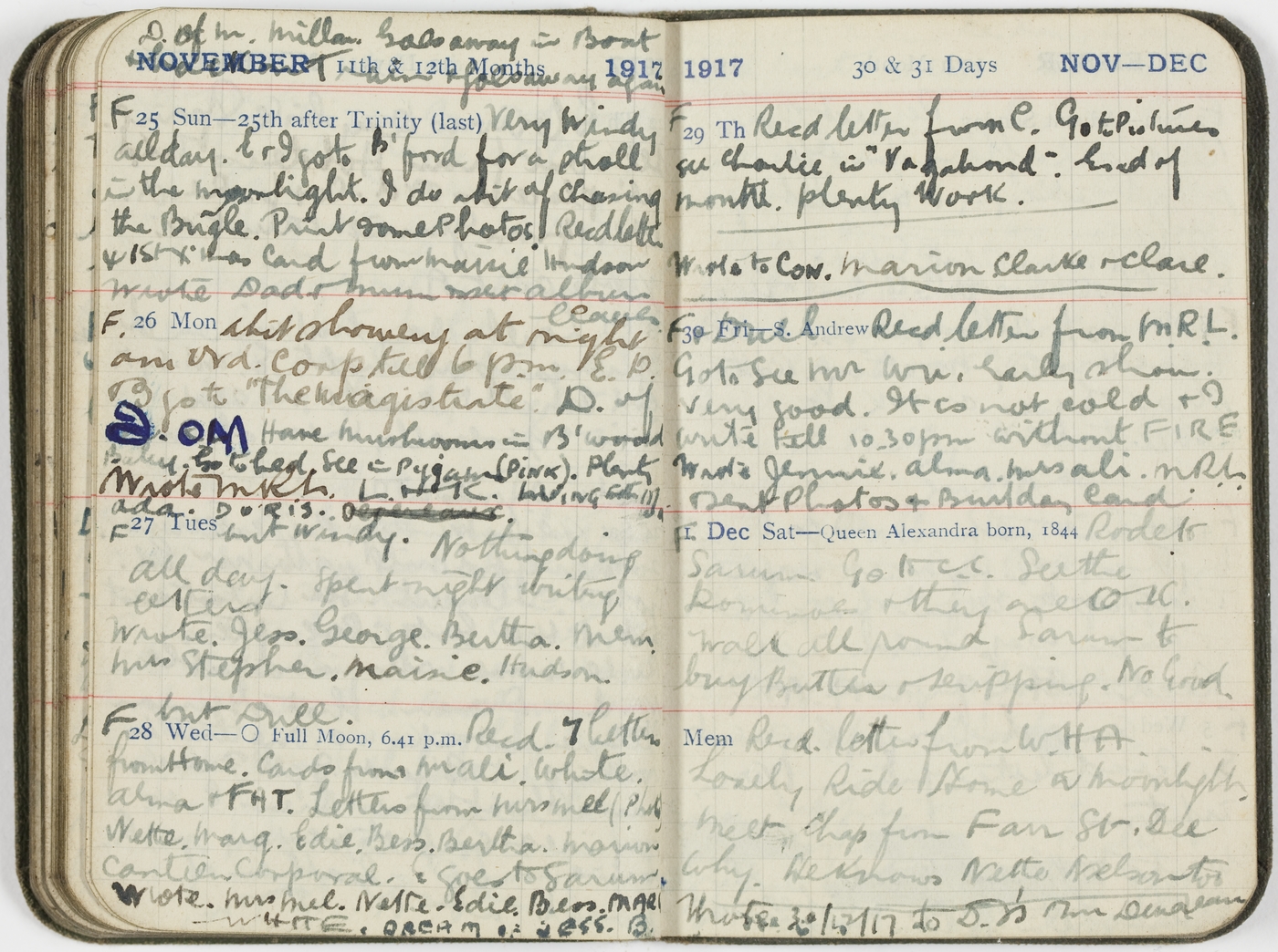 F [25/11/17 Sun] D. of M. Millar goes away in Boat & leaves on Train & goes away again. very windy all day. E & I go to B'ford for a stroll in the moonlight. I do a bit of Chasing the Bugle. Print some Photos. Recd letters & 1st X'mas Card from Maisie Hudson Wrote Dad & Mum & sent album leaves