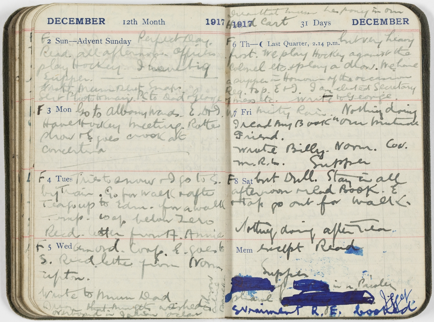 F but Dull [8/12/17 Sat] Stay in all afternoon & read Book. E & Top go out for a walk. Nothing doing after Tea except Read.