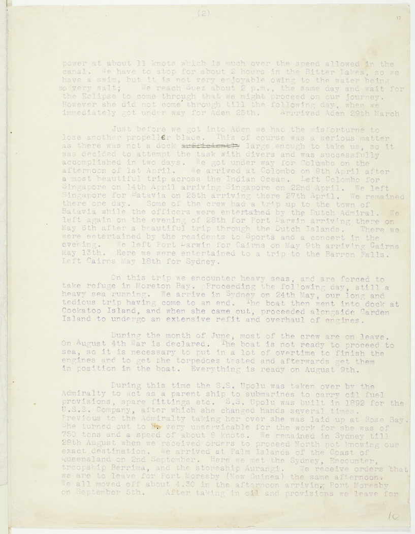 Just before we got into Aden we had the misfortune to lose another propeller blade. This of course was a serious matter as there was not a dock sufficiently large enough to take us, so it was decided to attempt the task with divers and was successfully accomplished in two days. We got under way for Colombo on the afternoon of 1st April. We arrived at Colombo on 9th April after a most beautiful trip across the Indian Ocean. Left Colombo for Singapore on 14th April arriving Singapore on 22nd April. We left Singapore for Batavia on 25th arriving there 27th April. We remained there one day. Some of the crew had a trip up to the town of Batavia while the officers were entertained by the Dutch Admiral. We left again on the evening of 28th for Port Darwin arriving there on May 6th after a beautiful trip through the Dutch Islands. There we were entertained by the residents to Sports and a concert in the evening. We left Port Darwin for Cairns on May 9th arriving Cairns May 13th. Here we were entertained to a trip to the Barron Falls. Left Cairns May 18th for Sydney.