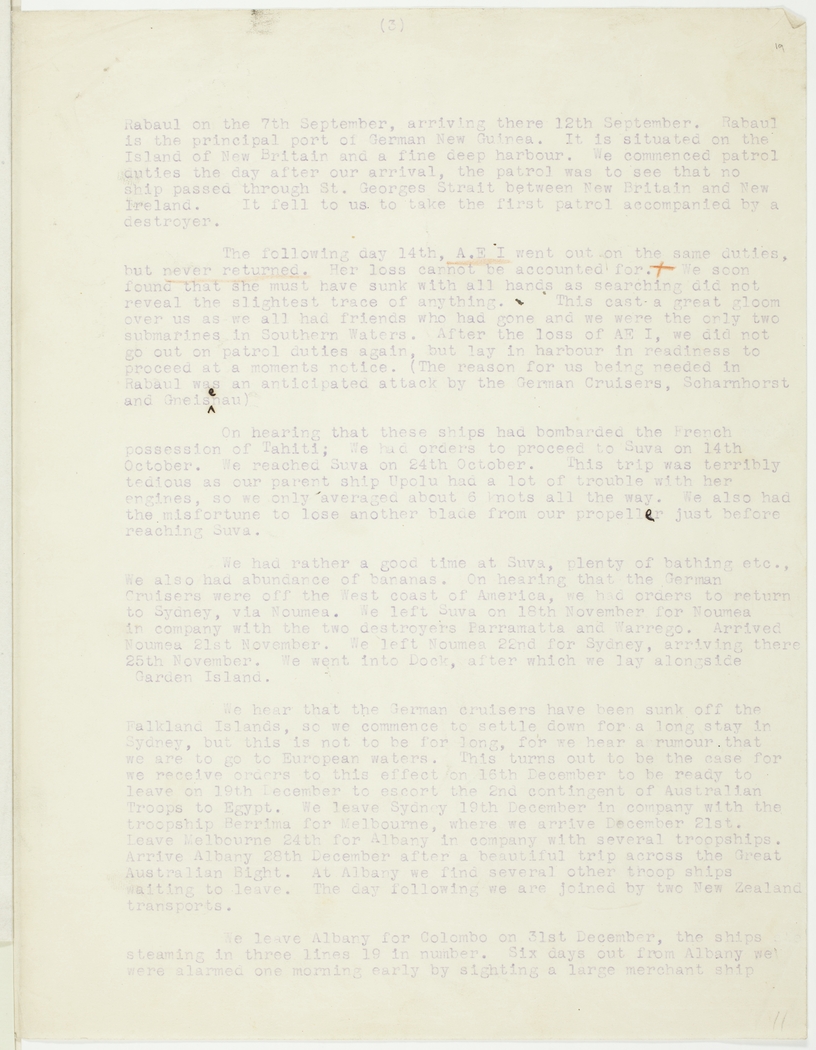 The following day 14th, A.E1 went out on the same duties, but never returned. Her loss cannot be accounted for. We soon found that she must have sunk with all hands as searching did not reveal the slightest trace of anything. This cast a great gloom over us as we all had friends who had gone and we were the only two submarines in Southern Waters. After the loss of AE 1, we did not go out on patrol duties again, but lay in harbour in readiness to proceed at a moments notice. (The reason for us being needed in Rabaul was an anticipated attack by the German Cruisers, Scharnhorst and Gneisenau)