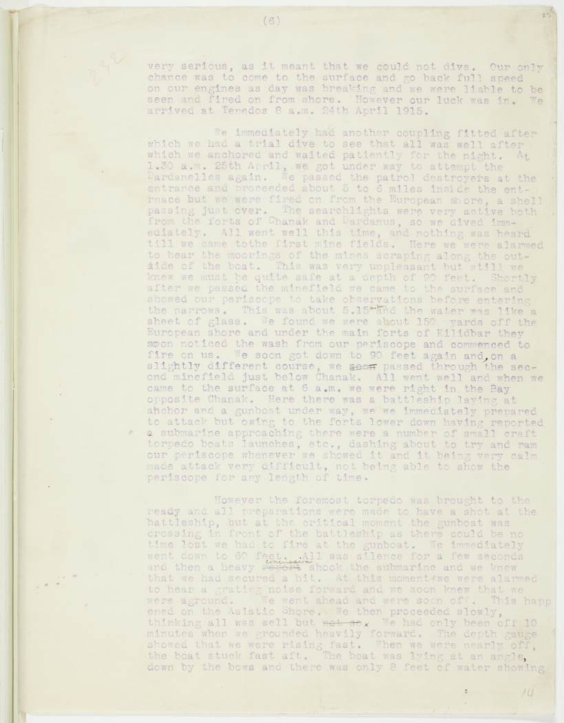 We immediately had another coupling fitted after which we had a trial dive to see that all was well after which we anchored and waited patiently for the night. At 1.30 a.m. 25th April, we got under way to attempt the Dardanelles again. We passed the patrol destroyers at the entrance and proceeded about 5 to 6 miles inside the entrance but we were fired on from the European shore, a shell passing just over. The searchlights were very active both from the forts of Chanak and Dardanus, so we dived immediately. All went well this time, and nothing was heard till we came to the first mine fields. Here we were alarmed to hear the moorings of the mines scraping along the outside of the boat. This was very unpleasant but still we knew we must be quite safe at a depth of 90 feet. Shortly after we passed the minefield we came to the surface and showed our periscope to take observations before entering the narrows. This was about 5.15 a.m. and the water was like a sheet of glass. We found we were about 150 yards off the European shore and under the main forts of Kilidbar they soon noticed the wash from our periscope and commenced to fire on us. We soon got down to 90 feet again and, on a slightly different course, we soon passed through the second minefield just below Chanak. All went well and when we came to the surface at 6 a.m. we were right in the Bay opposite Chanak. Here there was a battleship laying at anchor and a gunboat under way, we we immediately prepared to attack but owing to the forts lower down having reported a submarine approaching there were a number of small craft torpedo boats launches, etc., dashing about to try and ram our periscope whenever we showed it and it being very calm made attack very difficult, not being able to show the periscope for any length of time.