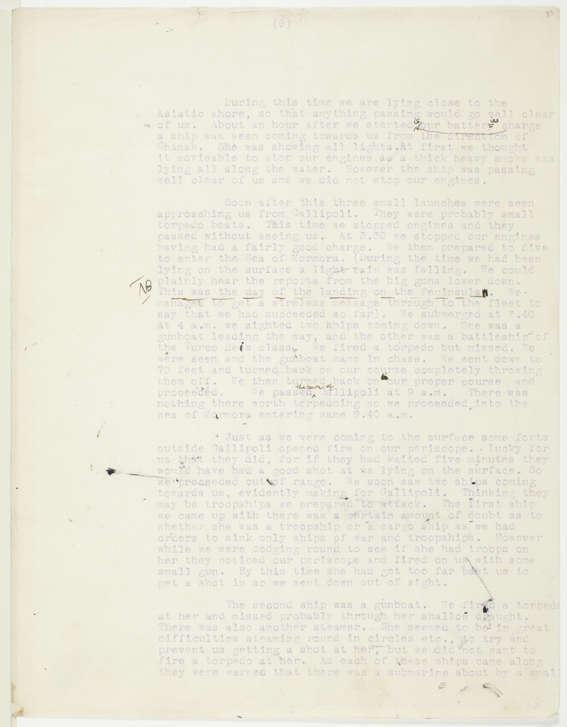 We managed to get a wireless message through to the fleet to say that we had succeeded so far). We submerged at 3.40 At 4 a.m. we sighted two ships coming down. One was a gunboat leading the way, and the other was a battleship of the Turco Reis class. We fired a torpedo but missed. We were seen and the gunboat came in chase. We went down to 70 feet and turned back on our course completely throwing them off. We then turned back on to our proper course and proceeded. We passed the town of Gallipoli at 9 a.m. There was nothing there worth torpedoing so we proceeded into the sea of Marmora entering same 9.40 a.m.