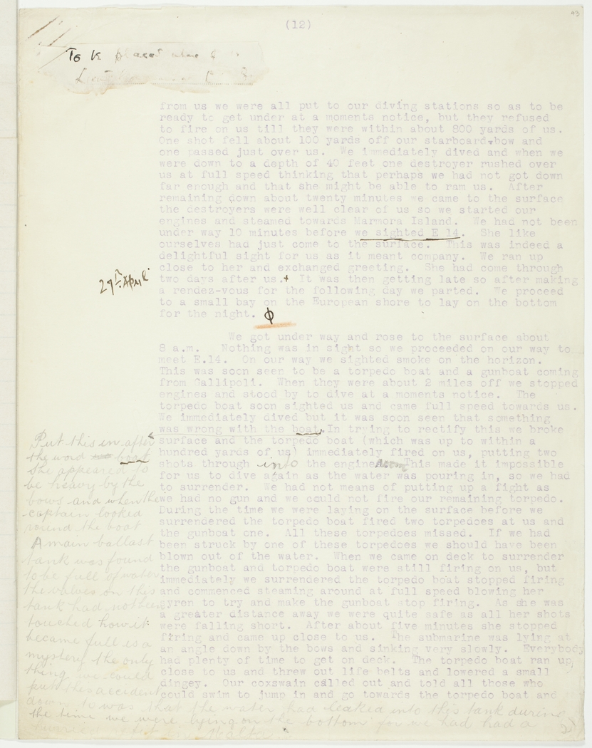 from us we were all put to our diving stations so as to be ready to get under at a moments notice, but they refused to fire on us till they were within about 800 yards of us. One shot fell about 100 yards off our starboard bow and one passed just over us. We immediately dived and when we were down to a depth of 40 feet one destroyer rushed over us at full speed thinking that perhaps we had not got down far enough and that she might be able to ram us. After remaining down about twenty minutes we came to the surface the destroyers were well clear of us so we started our engines and steamed towards Marmora Island. We had not been under way 10 minutes before we sighted E 14. She like ourselves had just come to the surface. This was indeed a delightful sight for us as it meant company. We ran up close to her and exchanged greeting. She had come through two days after us, 27th April. It was then getting late so after making a rendez-vous for the following day we parted. We proceed to a small bay on the European shore to lay on the bottom for the night. *