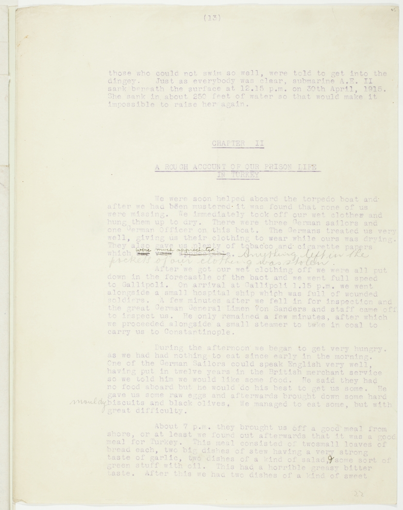 After we got our wet clothing off we were all put down in the forecastle of the baot and we went full speed to Gallipoli 1.15 p.mp we went alongside a small hospital ship which was full of wounded soldiers. A few minutes after we fell in for inspection and the great German General Limen Von Sanders and staff came off to inspect us. He only remained a few minutes, after which we proceeded alongside a small steamer to take in coal to carry us to Constantinople.