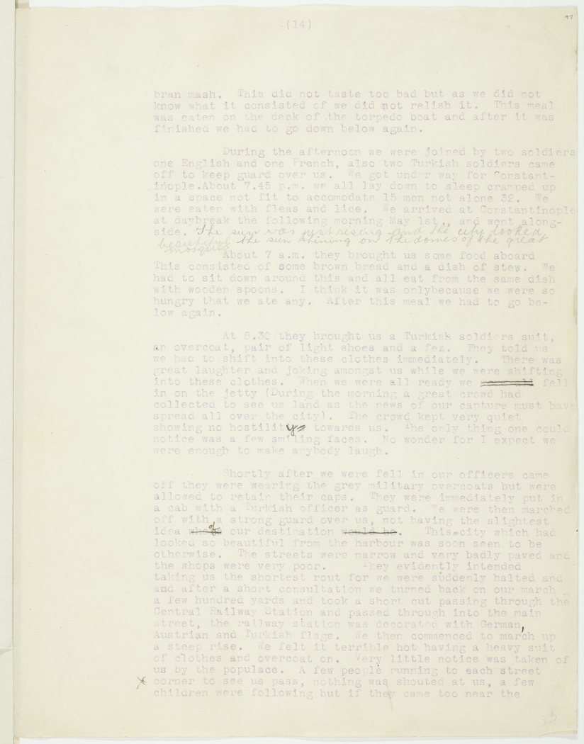 Shortly after we were fell in our officers came off they were wearing the grey military overcoats but were allowed to retain their caps. They were immediately put in a cab with a Turkish officer as guard. We were then marched off with a strong guard over us, not having the slightest idea of our destination would be. This city which had looked so beautiful from the harbour was soon seen to be otherwise. The streets were narrow and very badly paved and the shops were very poor. They evidently intended taking us the shortest rout for we were suddenly halted and and after a short consultation we turned back on our march a few hundred yards and took a short cut passing through the Central Railway Station and passed through into the main street, the railway station was decorated with German, Austrian and Turkish flags. We then commenced to march up a steep rise. We felt it terrible hot having a heavy suit of clothes and overcoat on. Very little notice was taken of us by the populace. A few people running to each street corner to see us pass, nothing was shouted at us, a few children were following but if they came too near the