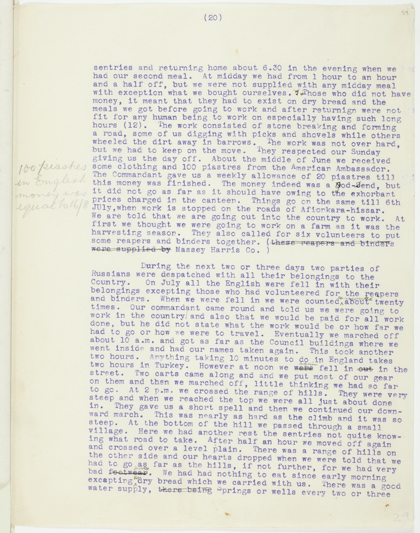 sentries and returning home about 6.30 in the evening when we had our second meal. At midday we had from 1 hour to an hour and a half off, but we were not supplied with any midday meal with exception what we bought ourselves. To those who did not have money, it meant that they had to exist on dry bread and the meals we got before going to work and after returnign were not fit for any human being to work on especially having such long hours (12). The work consisted of stone breaking and forming a road, some of us digging with picks and shovels while others wheeled the dirt away in barrows. The work was not over hard, but we had to keep on the move. They respected our Sunday giving us the day off. About the middle of June we received some clothing and 100 piastres from the American Ambassador. 100 piastres in English money was equal to 16/8. The Commandant gave us a weekly allowance of 20 piastres till this money was finished. The money indeed was a God-Send, but it did not go as far as it should have owing to the exhorbant prices charged in the canteen. Things go on the same till 6th July, when work is stopped on the roads of Afionkara-hissar. We are told that we are going out into the country to work. At first we thought we were going to work on a farm as it was the harvesting season. They also called for six volunteers to put some reapers and binders together. (these reapers and binders were supplied by Massey Harris Co.)