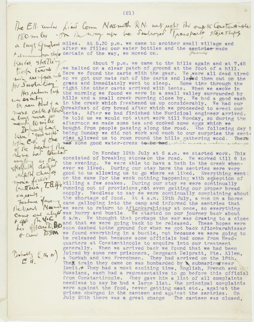 On Monday 12th July at 6 a.m. we started work. This consisted of breaking stones on the road. We worked till 6 in the evening. We were able to have a bath in the creek whenever we liked. During our stay here the sentries were very good to us allowing us to go where we liked. Everything went on the same for the week nothing happening with ecsxeption of killing a few snakes. During our stay we were continually running out of provisions, not even getting our proper bread supply. Needless to say we were continually complaining about the shortage of food. At 4.a.m. 19th July, a man on a horse came galloping into the camp and informed the sentries that we were to return to Afionkarahissar at once, so everything was hurry and bustle. We started on our journey back about 6 a/m. We thought that perhaps the war was drawing to a close and that we were going back to be released. These hopes were soon dashed to the ground for when we got back Afionkarahissar we found everything in a bustle, not because we were going to be released but because some officials had come from Headquarters at Constantinople to enquire into our treatment generally. When we arrived back we found that we had been joined by some new prisoners, Sergeant Delpratt, Pte. Allen, a Gurkah and two Frenchmen. They had arrived on the 18th. The train they came on was bombarded by a submarines near Ismit. Probably E 14 or E 11.