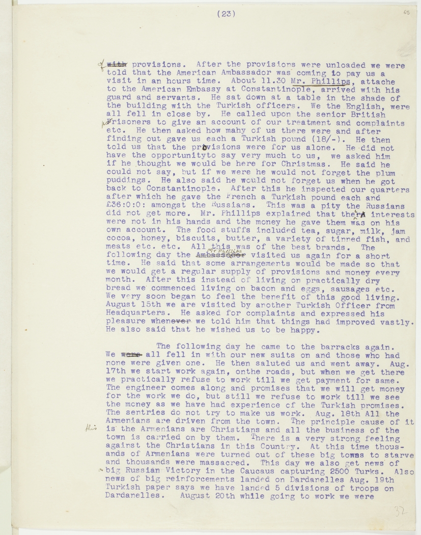 of with provisions. After the provisions were unloaded we were told that the American Ambassador was coming to pay us a visit in an hours time. After 11.30 Mr. Phillips, attaché to the American Embassy at Constantinople, arrived with his guard and servants. He sat down at a table in the shade of the building with the Turkish officers. We the English, were all fell in close by. He called upon the senior British prisoners to give an account of our treatment and complaints etc. He then asked how mahy of us there were and after finding out gave us each a Turkish pound (18/-). He then told us that the provisions were for us alone. He did not have the opportunity to say very much to us, we asked him if he thought we would be here for Christmas. He said he could not say, but if we were he would not forget the plum puddings. He also said he would not forget us when he got back to Constantinople. After this he inspected our quarters after which he gave the French a Turkish pound each and £36:0:0: amongst the Russians. This was a pity the Russians did not get more. Mr. Phillips explained that their interests were not in his hands and the money he gave them was on his own account. The food stuffs included tea, sugar, milk, jam cocoa, honey, biscuits, butter, a variety of tinned fish, and meats etc. All this was of the best brands. The following day the Ambassador Mr Phillips visited us again for a short time. He said that some arrangements would be made so that we would get a regular supply of provisions and money every month. After this instead of living on practically dry bread we commenced living on bacon and eggs, sausages etc. We very soon began to feel the benefit of this good living. August 15th we are visited by another Turkish Officer from Headquarters. He asked for complaints and expressed his pleasure whenever we told him that things had improved vastly. He also said that he wished us to be happy.