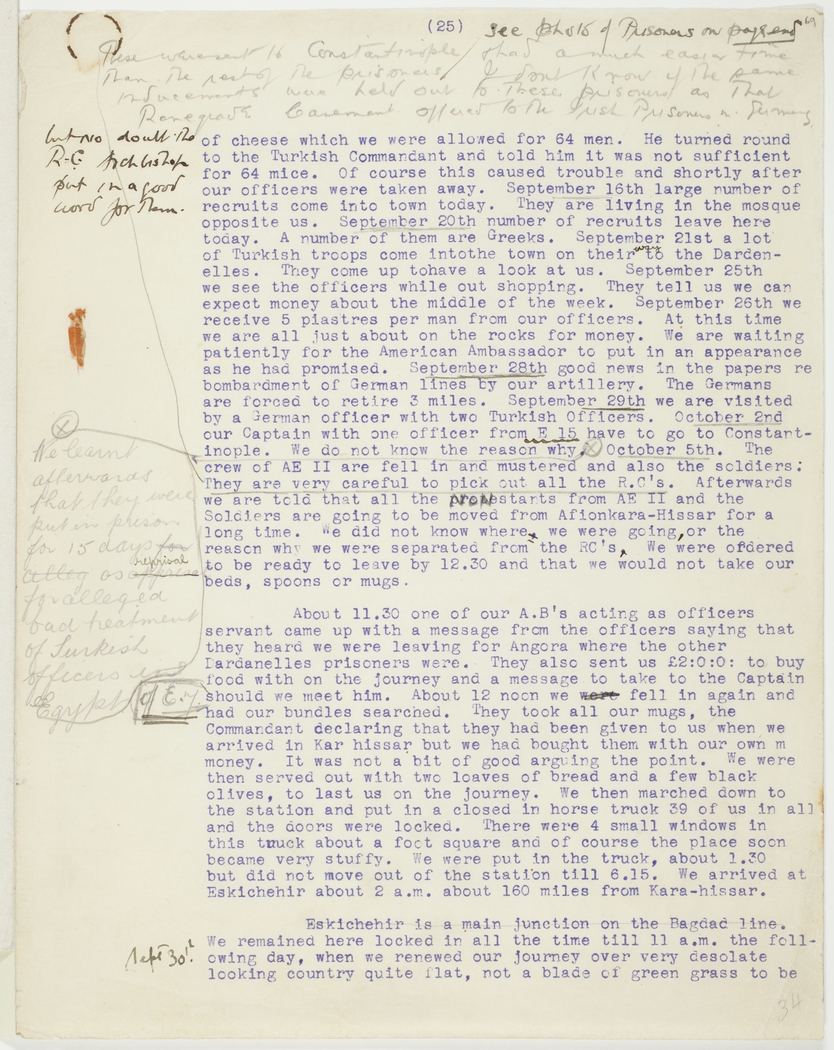 of cheese which we were allowed for 64 men. He turned round to the Turkish Commandant and told him it was not sufficient for 64 mice. Of course this caused trouble and shortly after our officers were taken away. September 16th large numbers of recruits come into town today. They are living in the mosque opposite us. September 20th number of recruits leave here today. A number of them are Greeks. September 21st a lot of Turkish troops come into the town on their way to the Dardanelles. They come up to have a look at us. September 25th we see the officers while out shopping. They tell us we can expect money about the middle of the week. September 26th we receive 5 piastres per man from our officers. At this time we are all just about on the rocks for money. We are waiting patiently for the American Ambassador to put in an appearance as he has promised. September 28th good news in the papers re bombardment of German lines by our artillery. The Germans are forced to retire 3 miles. September 29th we are visited by a German officer with two Turkish Officers. October 2nd our Captain with one officer from E 15 have to go to Constantinople. We do not know the reason why. October 5th. The crew of AE 11 are fell in and mustered and also the soldiers. They are very careful to pick out all the R.C's.