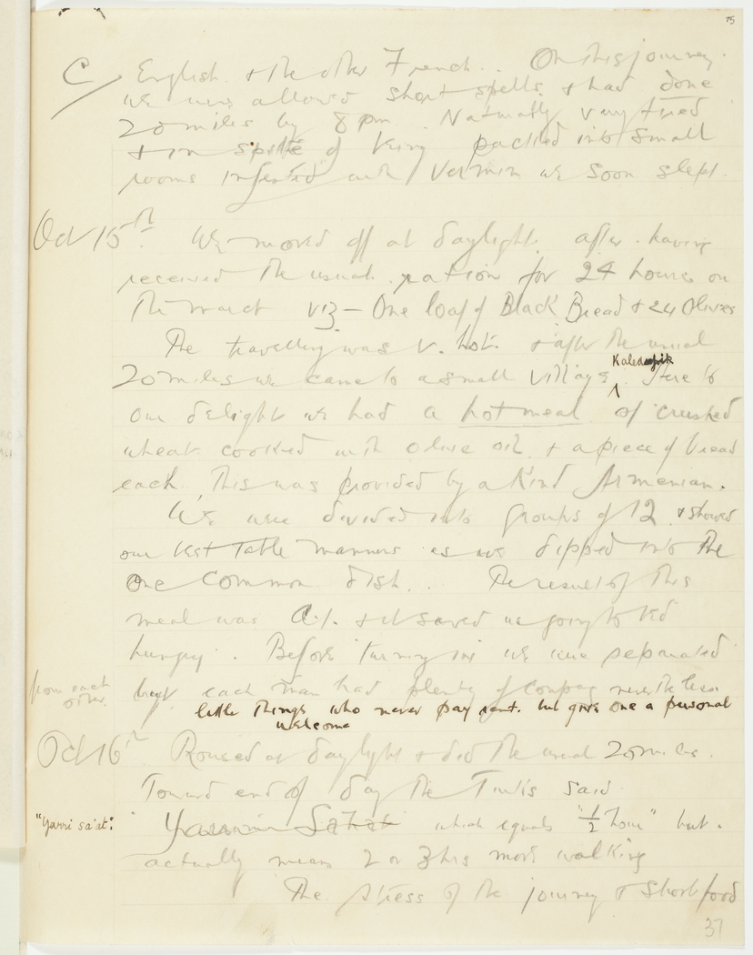 Oct 16th Roused on daylight & did the usual 20 miles. Toward end of day the Turks said Yarrin Sahat "Yarri sa'at." which means "1/2 hour" but actually means 2 or 3 hrs more walking