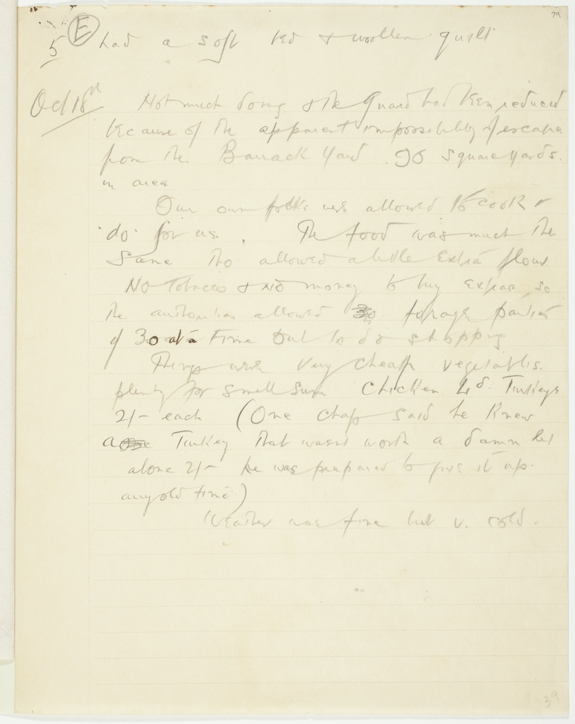 Oct 18th Not much doing & the guard had been reduced because of the apparent impossibility of escape from the Barrack Yard 90 square yards in area.